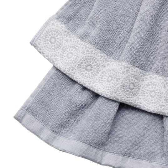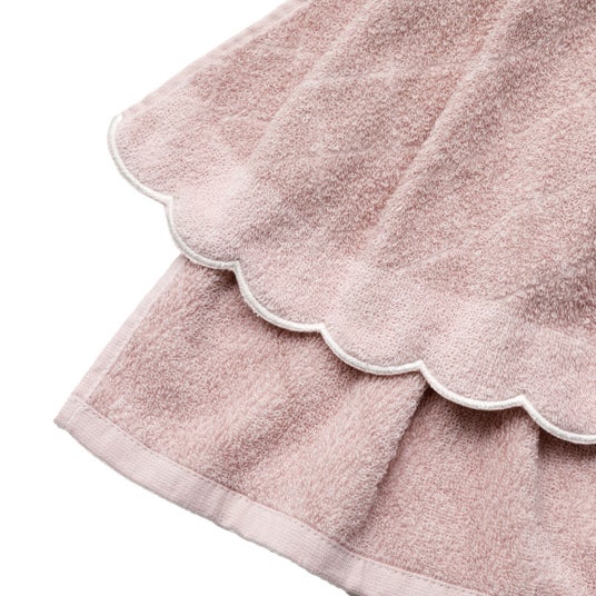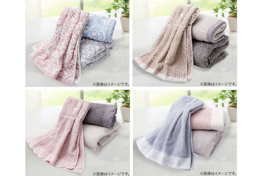 立体感のある織り柄とアクセントになるふちどりが特徴で、デザインはダマスク柄(上品な花模様のクラシックデザイン)・ヘリンボーン柄・ダイヤ柄・レース調の4種類、サイズはドレスタオル・フェイスタオル・バスタオルの3展開、カラーは各シリーズ3色をご用意。用途や設置場所に合わせて選びやすいラインアップです。