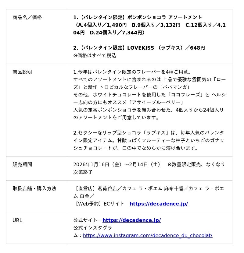 東京・茗荷谷からこだわりのショコラを発信する「デカダンス ドュ ショコラ(運営:株式会社グローバルダイニング)」はバレンタイン限定商品を2026年1月16日(金)より販売開始いたします。