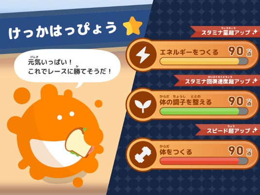 遊んでいるうちに「食べるものによって体の調子が変わるんだ」という気づきが自然と得られるようになっています。楽しみながら、栄養バランスの大切さを体感できるコンテンツです。