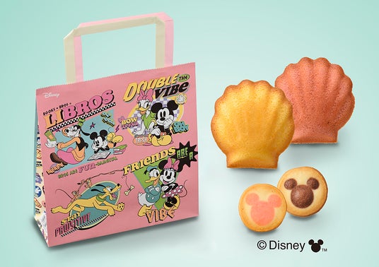 特長:「ミッキー」アイコン柄クッキーと、ふんわりしっとり焼き上げたマドレーヌ2種の詰め合わせです。バッグには、「ミッキーマウス」&「デイジーダック」、「ミニーマウス」&「ドナルドダック」など、いつもとは違うペアをワッペン風にデザイン。それぞれ読書したり、じゃれ合ったり、とっても楽しそう!