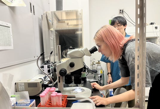 北海道大学の研究室にて顕微鏡で原生生物を観察する市原佐都子