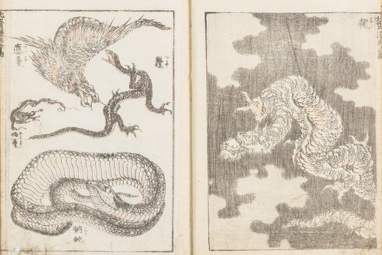 さまざまな龍の姿「龍」といってもその種類や姿は様々です。北斎は、代表作である『北斎漫画』や『冨嶽百景』の中に、「応龍」や「雨龍」など小さなものから大きなものまでさまざまの龍を描いています。北斎の知識と想像力もうかがうことができる作品の数々をご覧いただけます。