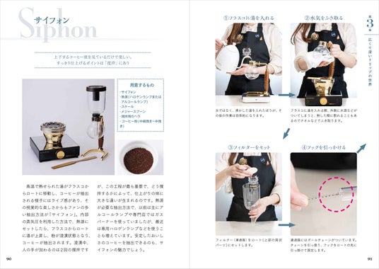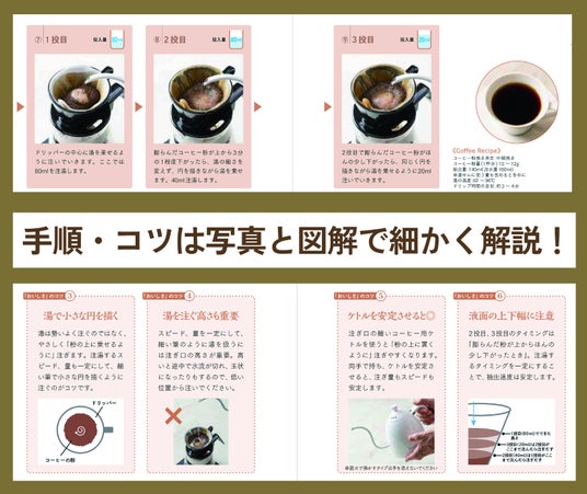 豊富なアレンジレシピや基本のハンドドリップの淹れ方、器具別の淹れ方(13種)を写真解説付きでわかりやすく収録。初心者の方でも理解しやすい工夫が満載