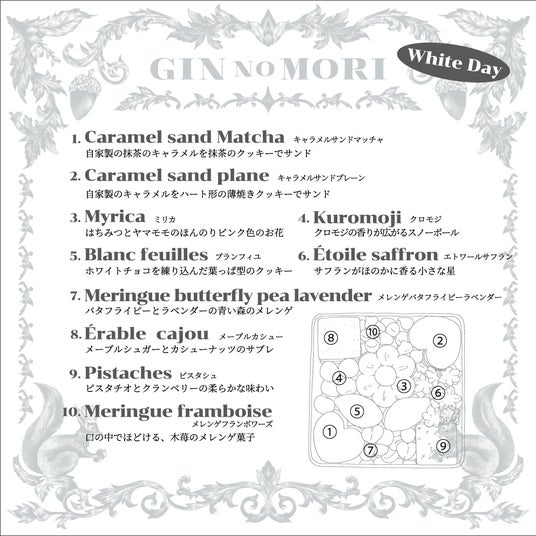 『銀の森にしかないお菓子を作るなら何がいいだろう?あっと驚くようなお菓子を。』パティスリー GIN NO MORIの数々の森の恵みの洋菓子を生み出しているのは2匹のリスの料理人。森の恵みを日々研究し、新しい味を生み出す料理長のチェスと、五感を頼りに美味しい食材を探し出すのが得意な副料理長のナッツ。アイデアあふれるお菓子を、心を込めて丁寧に手作りしています。