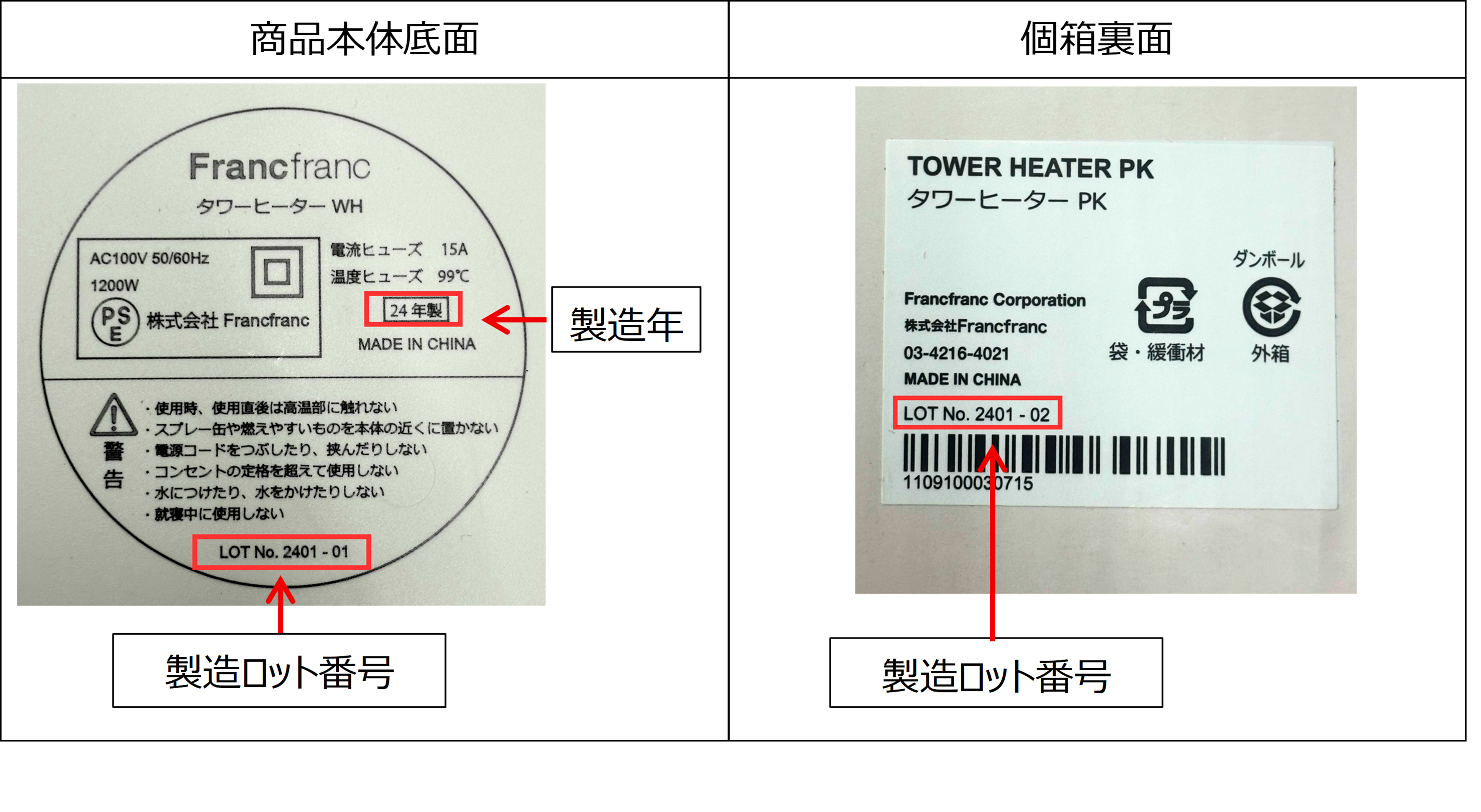 商品本体底面および個箱の裏面に、製造ロット番号が印字されています。