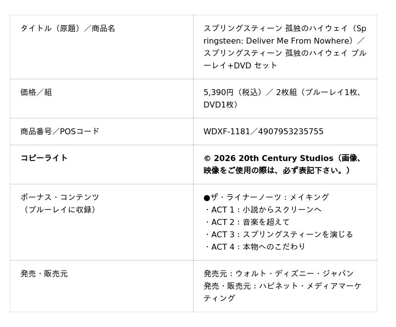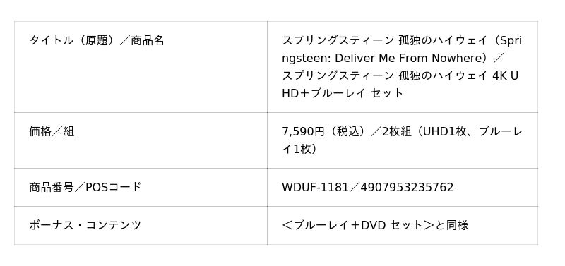 この度発売のブルーレイ+DVDセット、4K UHD+ブルーレイ セット、デジタル配信(購入)には、映画の舞台裏に迫る、ファン必見のメイキング映像を収録。偉大なロック・レジェンドの孤独と創造の旅-『スプリングスティーン 孤独のハイウェイ』を、ぜひブルーレイ+DVDセット、4K UHD+ブルーレイ セット、そしてデジタル配信(購入/レンタル)でお楽しみください。