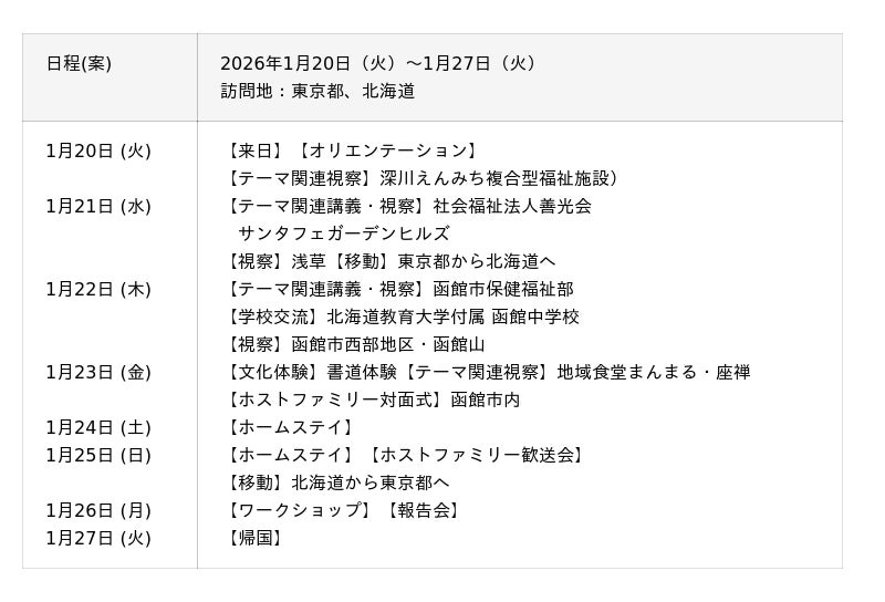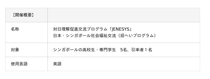 「対日理解促進交流プログラムJENESYS」JENESYSプログラムにおいて社会福祉をテーマにシンガポールの学生など6名が来日します
