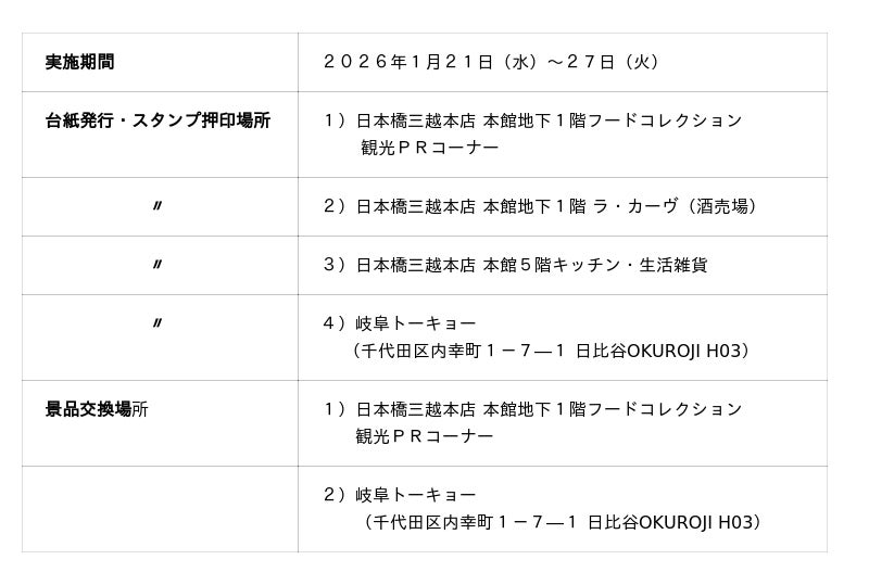 会期中、日本橋三越本店地下1階(2ヶ所 )と5階(1ヵ所)、アンテナショップ 岐阜トーキョー(千代田区内幸町)(※3)の計4ヶ所で、東京にいながら岐阜を楽しめるスタンプラリーを実施。スタンプを4つ集めた方に、岐阜の県産品を進呈します。また、観光PRコーナー(日本橋三越本店地下1階フードコレクション内)では、岐阜のおすすめスポットや知られざる魅力をお伝え。週末には、マスコットキャラクター<ミナモ>も登場します。※3)岐阜トーキョー:さまざまな魅力にあふれる“岐阜”を、東京・銀座で存分に満喫していただける
