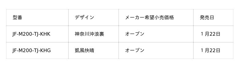 『JF-M200-TJ-KHK』は、北斎芸術の象徴ともいえる「神奈川沖浪裏」の絵柄を採用しました。ダイナミックな波の構図と深い藍色が印象的なこの作品は、力強さと美しさを併せ持つ代表的な浮世絵として世界中で愛され続けています。
