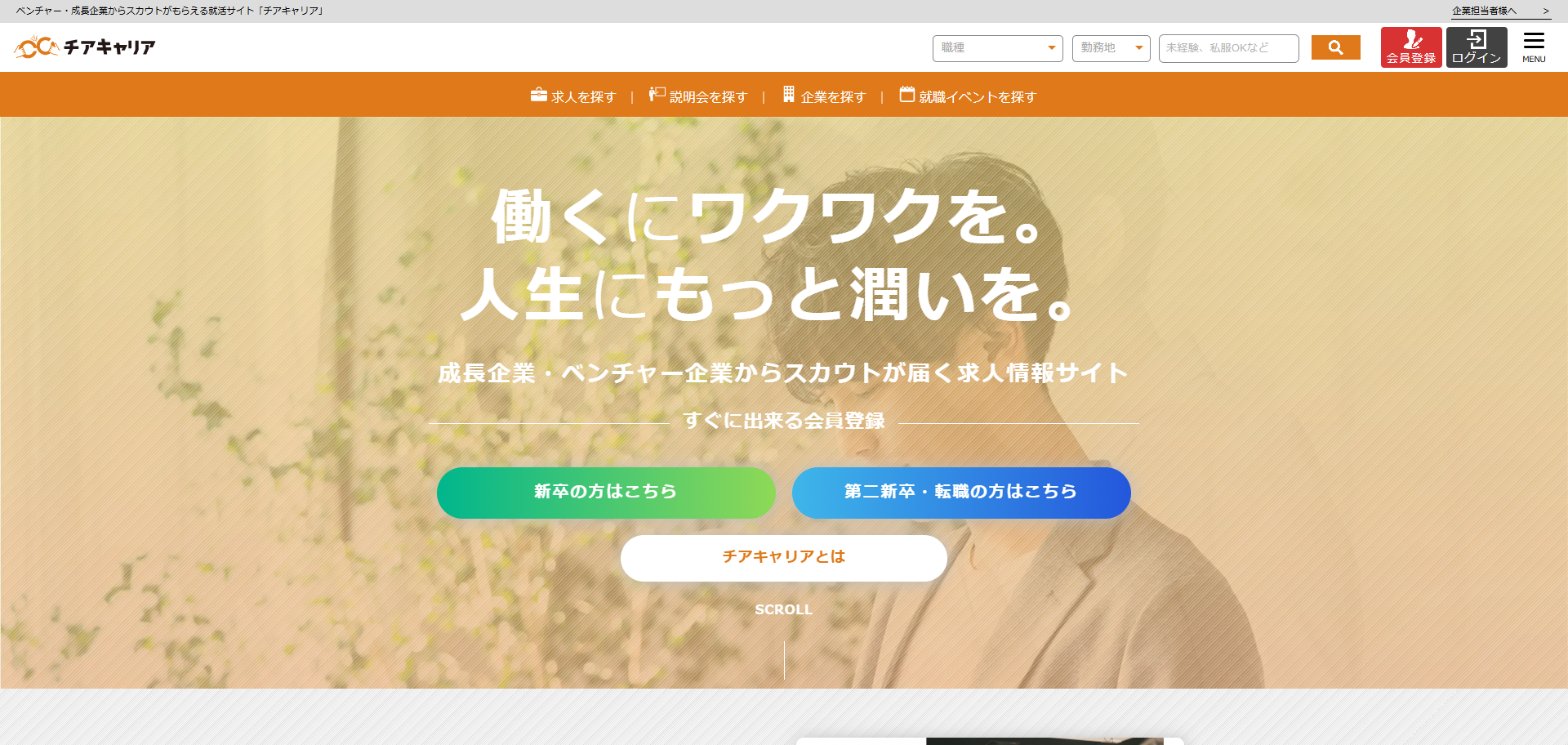チアキャリアは地方創生と教育をテーマに『働くにワクワクを。 人生にもっと潤いを。』増やすための、働く選択肢が広がることを目的とした、年間10万人が利用するベンチャー・成長企業にフォーカスした就職サイトです。