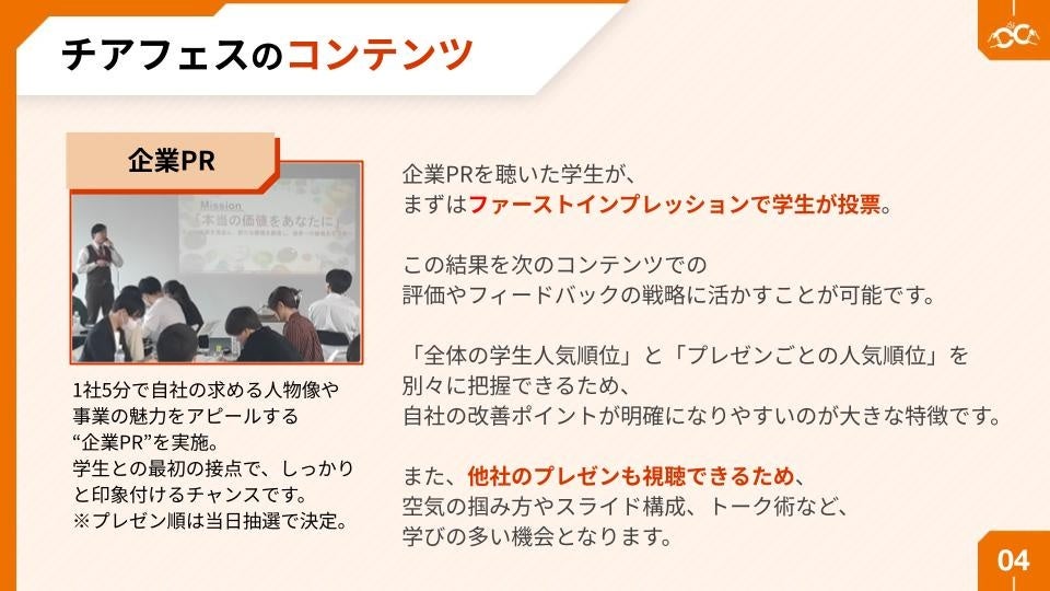 参加学生に自社の理念や特徴をプレゼンできるコンテンツです。