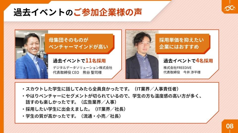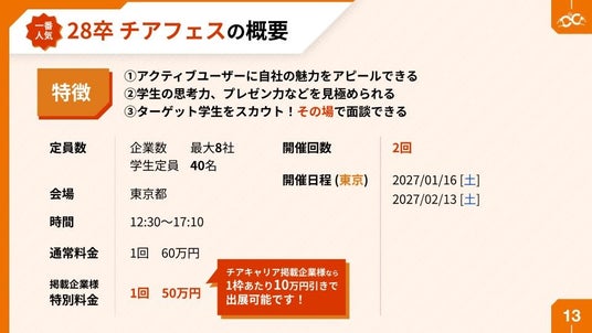 この27卒での圧倒的な採用成功実績とイベントニーズの急増を受け、28卒においては開催日程の早期リリースと大幅な増枠を決定いたしました。より多くの企業様に採用成功の機会を提供し、中小・ベンチャー企業の採用課題解決に貢献してまいります。