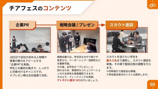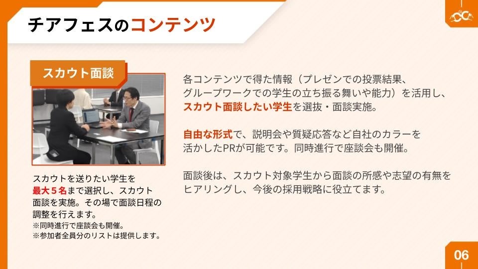 グループワークやプレゼンの機会があり、コミュニケーション力、思考力、人間性を効率よく見極められます。3.その場で評価した学生と接点が持てる(スカウト面談)