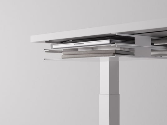 デスクの天板裏にラップトップPCや書類、資料などを収納。側面の切れ込みでケーブルもきれいに取り回せる、二段構造にすれば収納力もアップ。