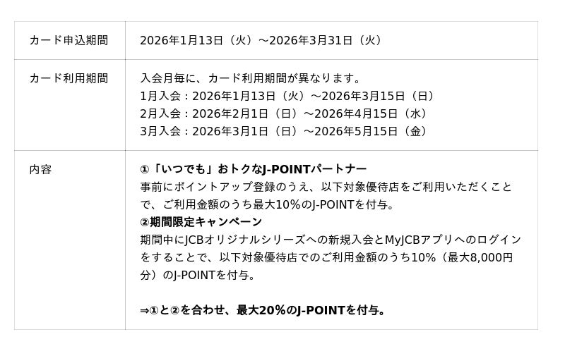 株式会社ジェーシービー (本社:東京都港区、代表取締役会長兼執行役員社長:二重 孝好、以下:JCB)は、2026年1月13日(火)から2026年3月31日(火)の間、「【新規入会限定】対象優待店の利用で最大20%還元」を実施します。