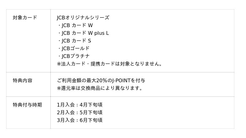 ポイントアップ登録での最大10%還元と新規入会&対象期間限定での10%還元(最大8,000ポイント)を合わせて、JCBの新ポイント「J-POINT」が最大20%還元されます。