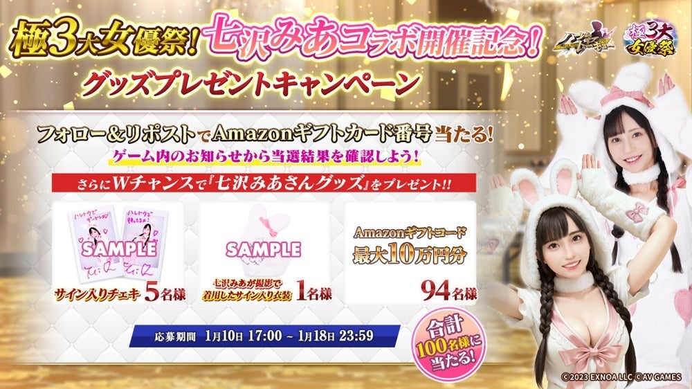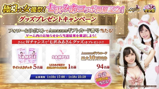 人気女優の七沢みあさんとのコラボレーションを記念して、抽選でゲーム内に登場する衣装を着用したサイン入りチェキや、撮影時に着用した衣装が当たるキャンペーンを実施致します。