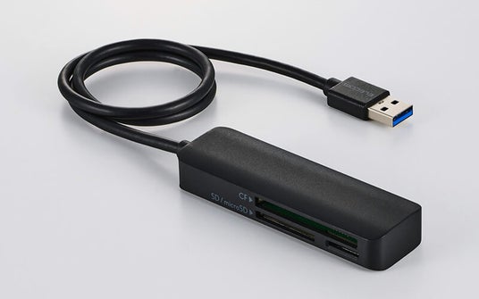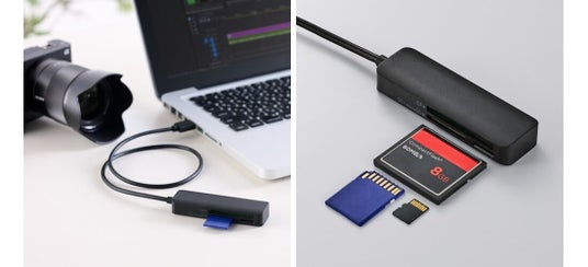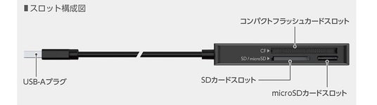 SDカードシリーズ、microSDカードシリーズに加え、デジタル一眼レフカメラなどで使用されるコンパクトフラッシュにも対応した3スロット仕様のメモリーカードリーダーです。SD/microSDカード用の2スロットはいずれもUHS-I(最大104MB/s)、コンパクトフラッシュスロットはType I(最大167MB/s)に対応しており、対応するパソコンと組み合わせることで、高解像度写真や大容量動画ファイルなどのデータを高速で転送できます(いずれも理論値)。パソコン側との接続は、USB 5Gbps対応のUSB-Aコネクターを採用しています。