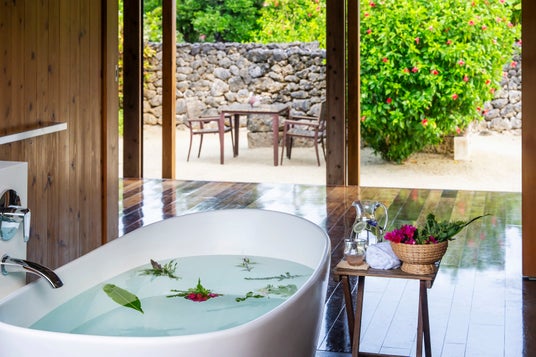 風が吹き抜ける客室で楽しむ、命草を浮かべた湯船