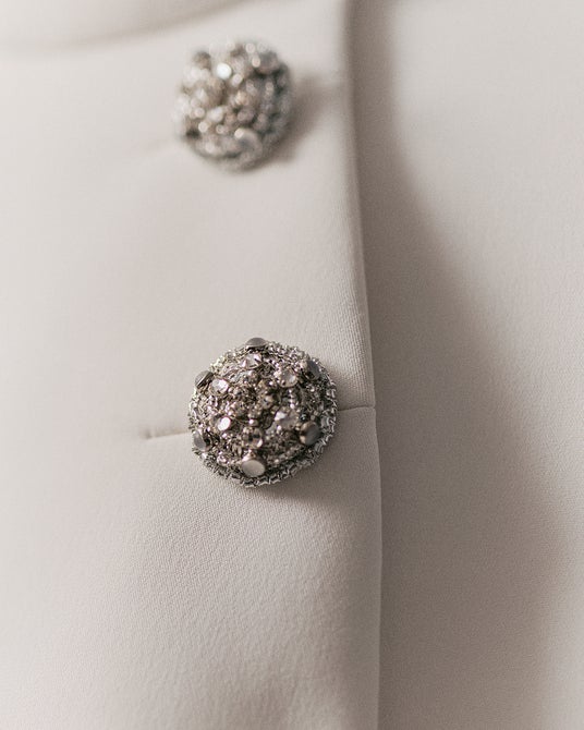 エミリー・ブラントは、ホワイトのシルクヘビークレープ素材のノースリーブドレスに、シルバーのジュエリーボタンのディテールを施した、同カラーのワンショルダーショートケープを合わせました。