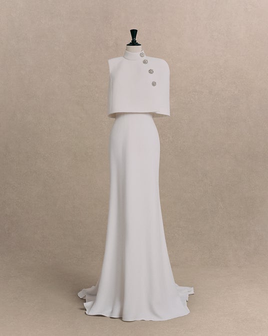 ホワイトのシルクヘビークレープ製ノースリーブドレスは、ケープが構築的なデザインで、ハイカラー仕様となっており、シルバーのジュエリーボタンを装飾したアシンメトリーな留め具が特徴です。
