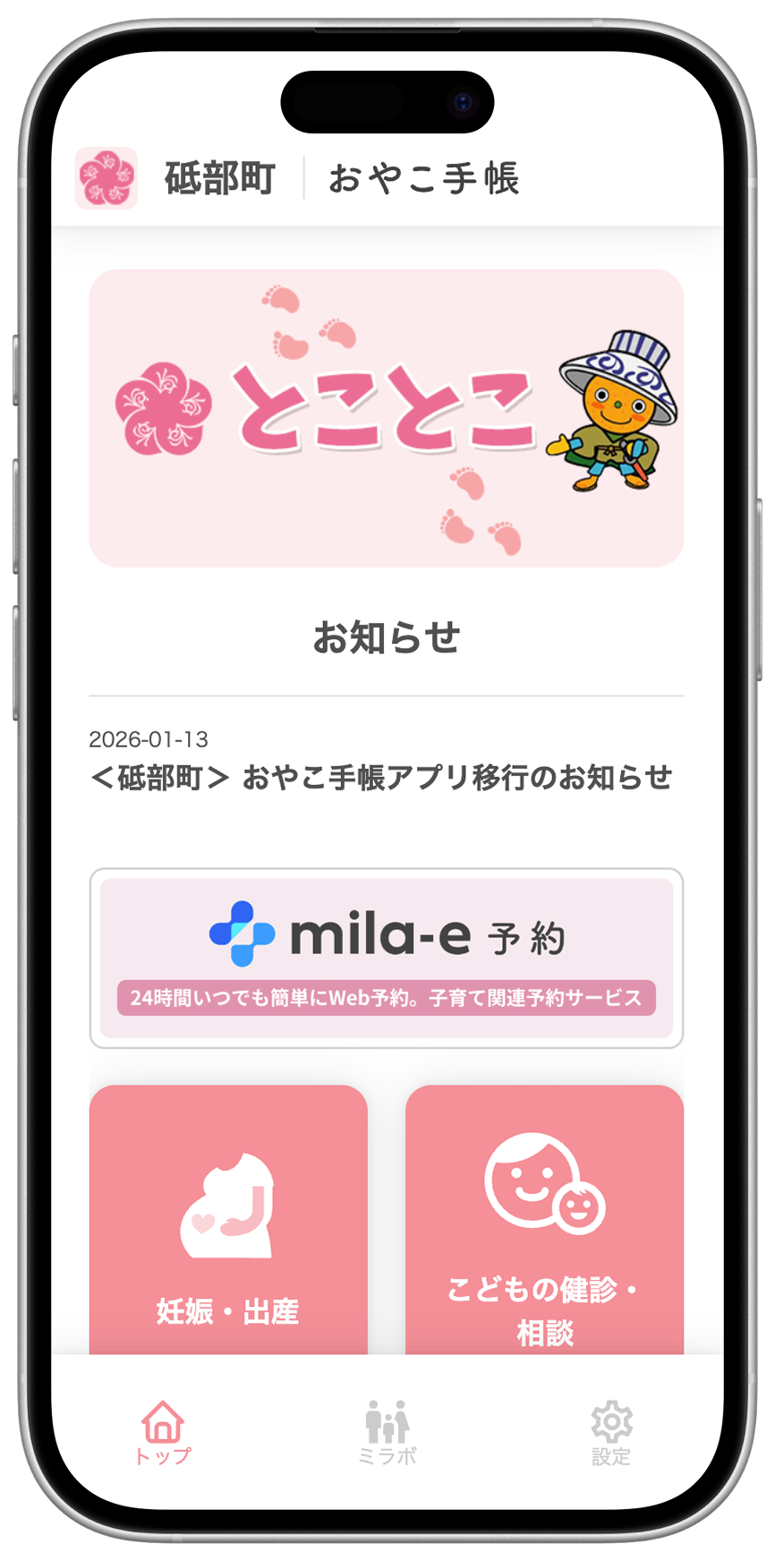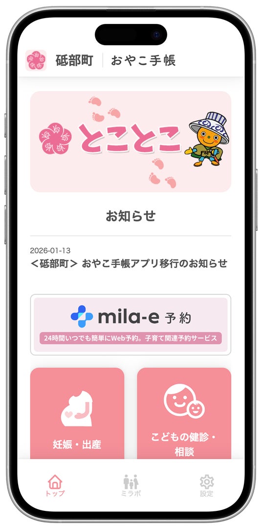 自治体向けサービスを開発する株式会社ミラボ(本社:東京都千代田区、代表取締役:谷川一也、以下「ミラボ」)の母子手帳アプリ「mila-e(ミライー) おやこ手帳」が、愛媛県 砥部町に導入され、「とことこ」として 提供を開始しました。