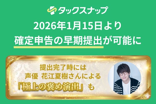 株式会社タックスナップ(代表取締役CEO:田中 雄太、本社:東京都杉並区)は、確定申告アプリ「タックスナップ」において、2026年1月15日(木)より確定申告の早期提出が可能になることをお知らせいたします。タックスナップを利用することで、通常受付開始日(2月16日)よりも早く確定申告のストレスから解放されます。