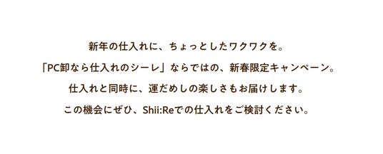 画像内文章「新年の仕入れに、ちょっとしたワクワクを。「PC卸なら仕入れのシーレ」ならではの、新春限定キャンペーン。仕入れと同時に、運だめしの楽しさもお届けします。この機会にぜひ、Shii:Reでの仕入れをご検討ください。」