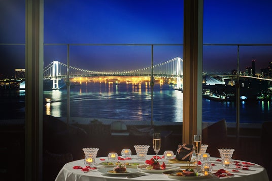 東京湾のパノラマビューを望むロマンティックな空間で、ディナーコースを堪能。(マンハッタン)