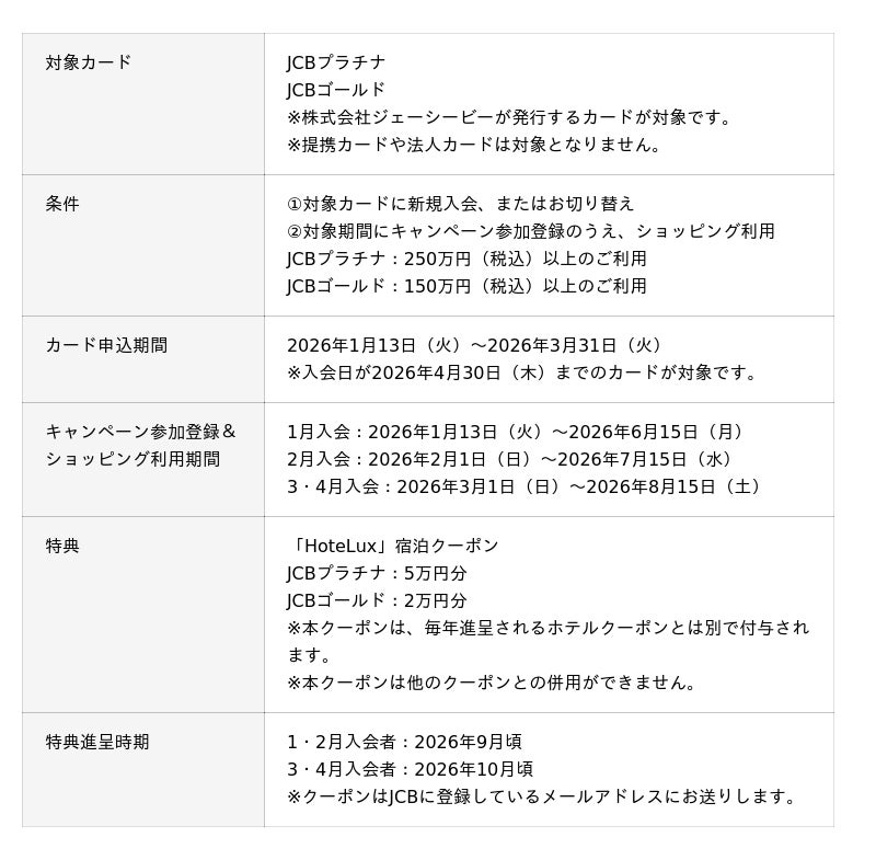 株式会社ジェーシービー (本社:東京都港区、代表取締役会長 兼 執行役員社長:二重 孝好、以下:JCB)は、2026年1月13日(火)から2026年3月31日(火)の間、「JCBプラチナ・JCBゴールド新規入会限定 「HoteLux」宿泊クーポンを最大5万円分プレゼント」キャンペーンを実施します。