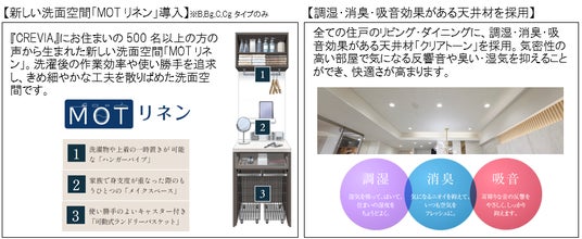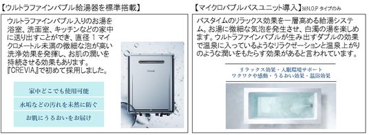 本物件では、『CREVIA』として初めてウルトラファインバブル給湯器を標準搭載。多目的な収納空間に変更することもできるシューズインクローク「FiTIO」採用など、快適な暮らしを支える様々な先進設備を導入しています。