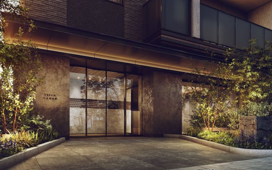 建物の外観は、グレーとアースカラーを基調に、手作り感や素材感のあるマテリアルを使用することで、落ち着いた街並みに調和しながらも存在感のあるデザインとしました。バルコニーの水平ラインを二重に強調したファサードと、ランダムに配した2種類のマリオン、シャープなガラスの手すりを組み合わせ、端正でありながらも柔らかさを感じる表情を創出。豊かな植栽を配したエントランスアプローチは、静かな佇まいと格調の高さを感じる空間に仕上げました。