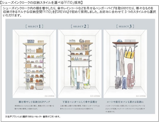 本物件では、『CREVIA』として初めてウルトラファインバブル給湯器を標準搭載。さらに、シューズインクロークを靴の収納場所としてだけではなく、多目的に使える収納空間にできるよう、3つのスタイルから収納を選べる「FiTIO」採用など、暮らしがより豊かになる住まいをめざしました。