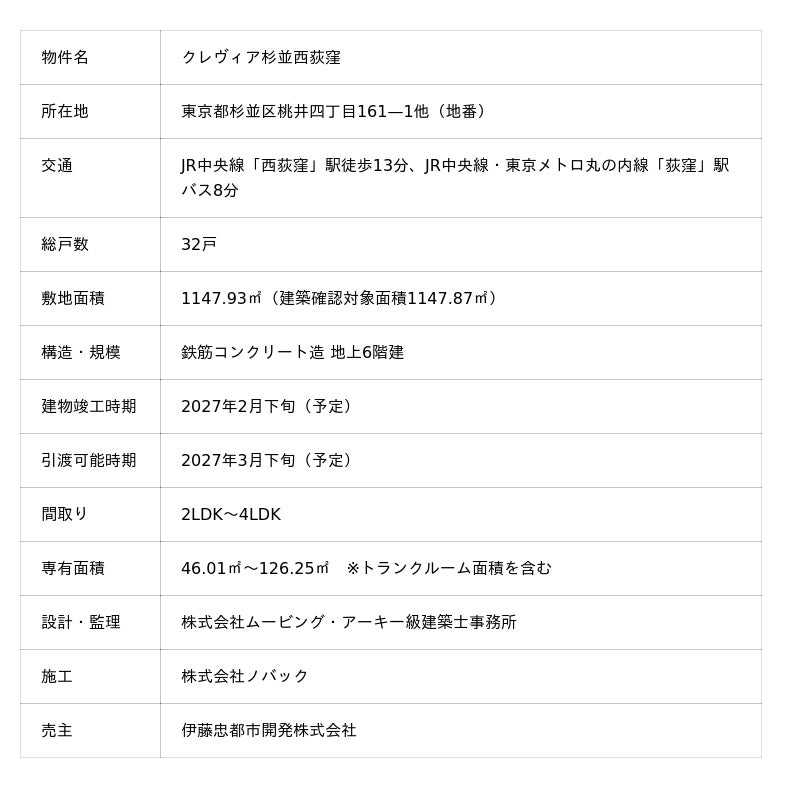 伊藤忠都市開発株式会社(本社:東京都港区、代表取締役社長:松 典男)は、東京都杉並区桃井4丁目で開発中の新築分譲マンション「クレヴィア杉並西荻窪」について、2026年1月17日(土)より、コンセプトルームの一般案内を開始し、2026年2月下旬(予定)より販売を開始致します。
