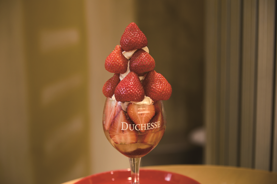 約17粒の大きく艶やかな苺が芸術作品のように飾られた苺のパフェ。グラス部分は、上品な自家製苺ゼリーや苺のコンフィチュール、カスタードクリームがあり、軽やかな甘さが苺の甘みを引き立たせ、贅沢感を堪能できます。