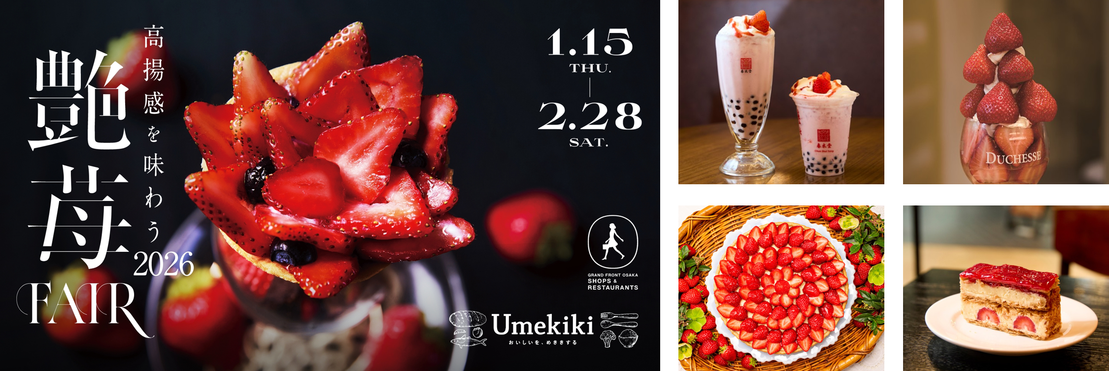 グランフロント大阪ショップ&レストラン(大阪市北区大深町)では、2026年1月15日(木)の「いちごの日」を皮切りに2月28日(土)までの期間、「艶苺FAIR」と題した苺フェアを開催いたします。昨年度大好評をいただいた本フェアでは、今まさに旬を迎える「苺」が楽しめる、多様な苺スイーツやグルメを提供します。フェア限定メニューや冬季限定メニューなど、苺好きの心を掴む甘酸っぱく贅沢な苺メニューを、昨年より規模を拡大し計17店舗でお楽しみいただけます。