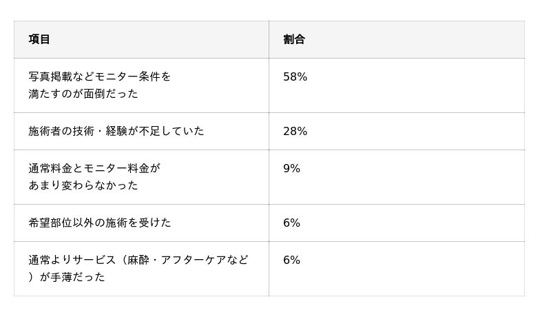 アートメイクのモニターを利用した際のデメリットとして、「写真掲載などモニター条件を満たすのが面倒だった」と回答した人が全体の58%で最多でした。