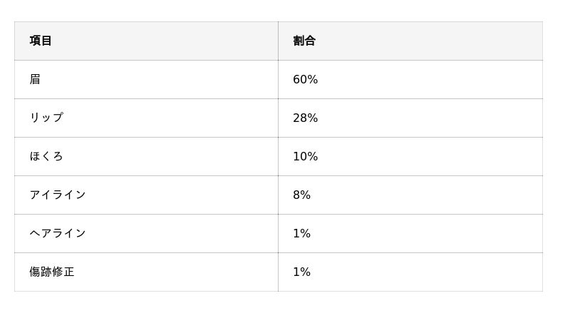- 施術箇所は「眉」が60%で最多。「リップ」(28%)、「ほくろ」(10%)などでモニターを利用した人もいる
