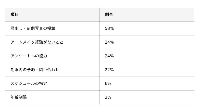 - 条件は「顔出し・症例写真の掲載」が58%で過半数を占めた