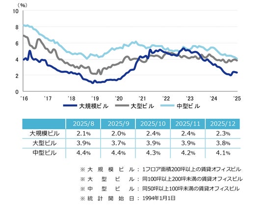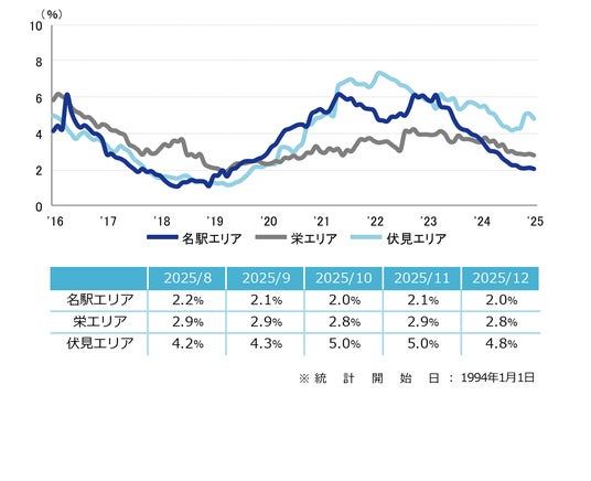 2025年は約6千坪と比較的低水準の供給量に止まったが、2026年は栄エリアを中心に約3万坪の大量供給が予定されている。多くのビルでテナント誘致が進み既に高い内定率にあることから、新規供給により需給バランスが大きく緩むことはないとみられる。また、今年の新築ビルに移転するテナントによる二次空室は足元では限定的な水準に止まっており、今後の動向が注目される。(名古屋支店長 妹尾哲也)