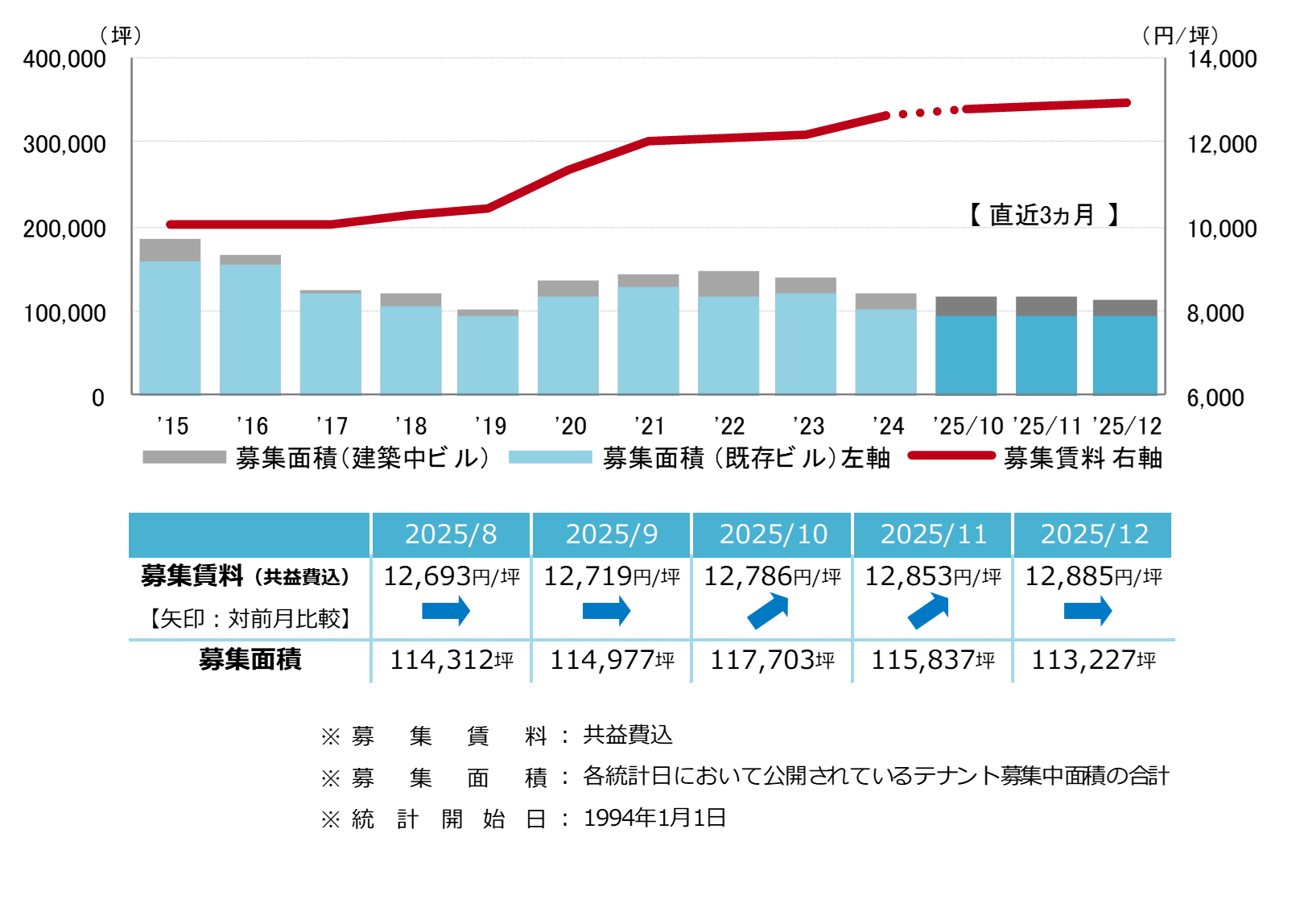 募集賃料は前月比プラス32円/坪の12,885円/坪と、4ヵ月連続の上昇となった。賃料は緩やかな上昇傾向にあり、13,000円/坪台が迫っている。
