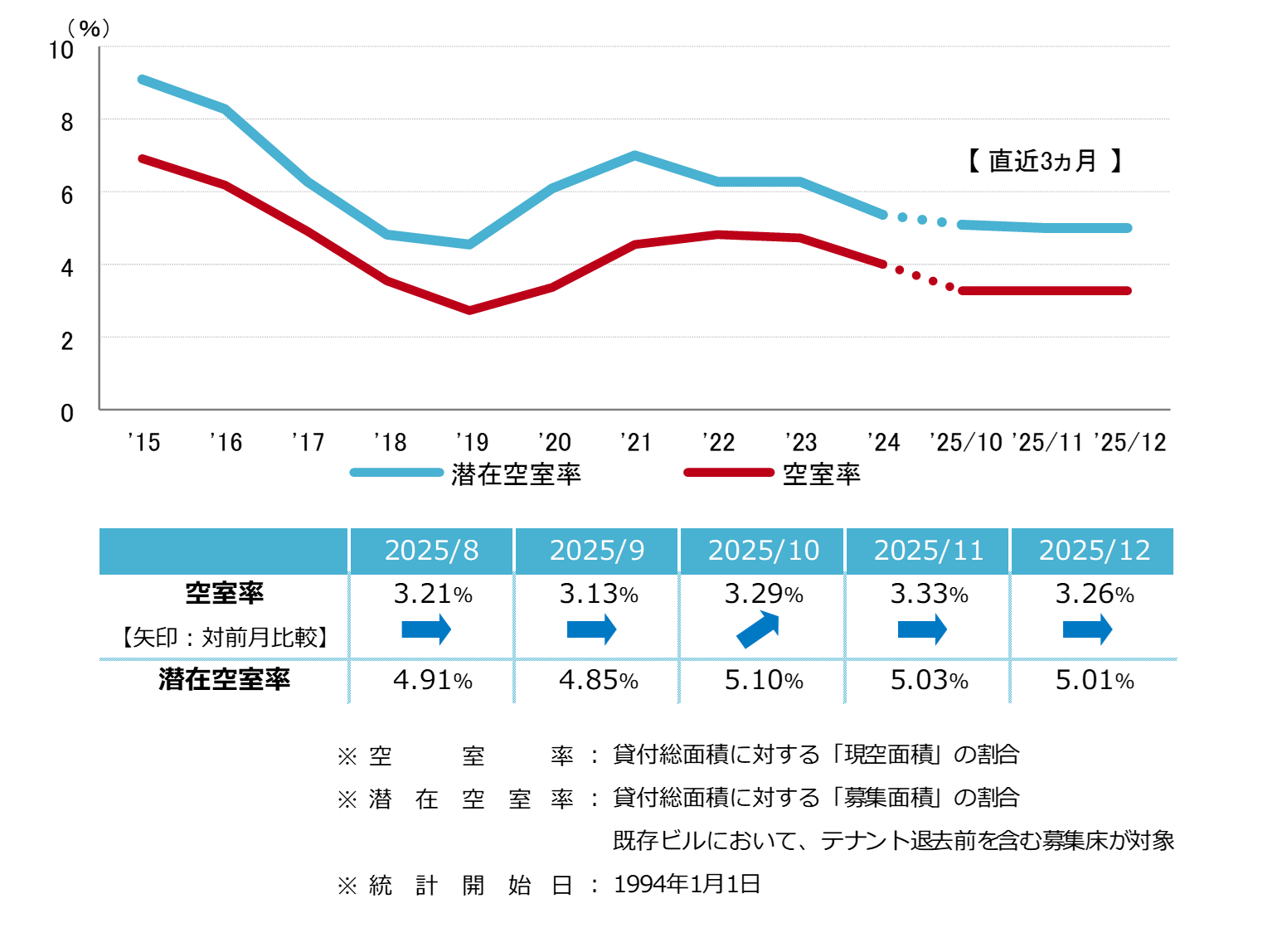 空室率は前月比マイナス0.07ポイントの3.26%となり、3ヵ月ぶりで小幅に低下した。主要エリアの新築・築浅ビルを中心に空室消化が進んでいる。エリア別の「名駅」は2020年3月以来の1%台が目前に迫っている。潜在空室率は前月比マイナス0.02ポイントの5.01%だった。