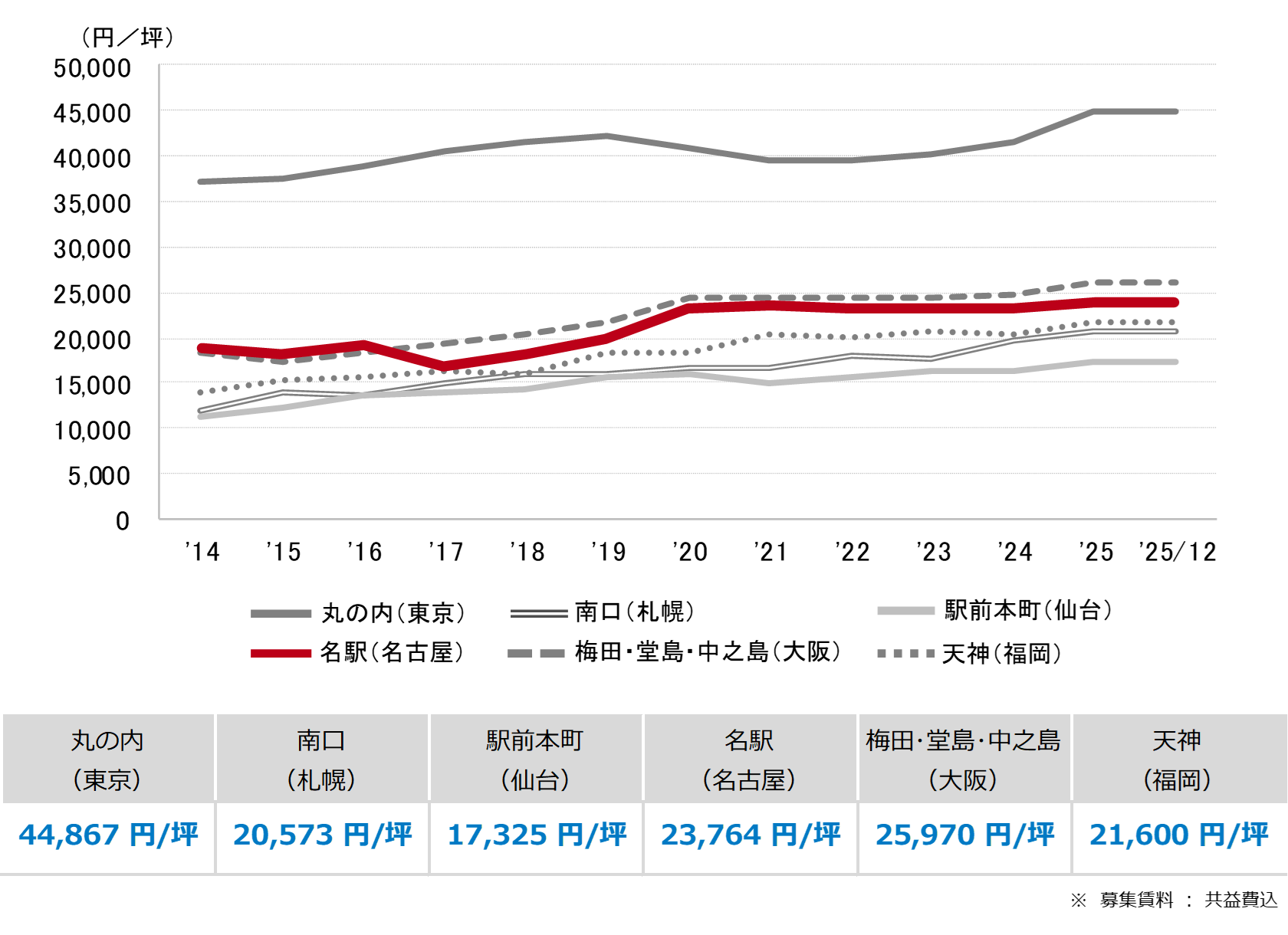 三幸エステート株式会社(本社:東京都中央区、取締役社長:福島正二郎)は、2025年12月度の名古屋市オフィス賃貸状況(空室率&現空面積:全規模、募集賃料&募集面積:全規模、規模別空室率、主要エリア※1空室率:全規模)および全国6大都市(東京・札幌・仙台・名古屋・大阪・福岡)の大規模ビルのマーケットデータをまとめた「オフィスマーケット2026年1月号名古屋」を公表します。