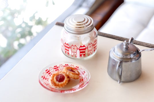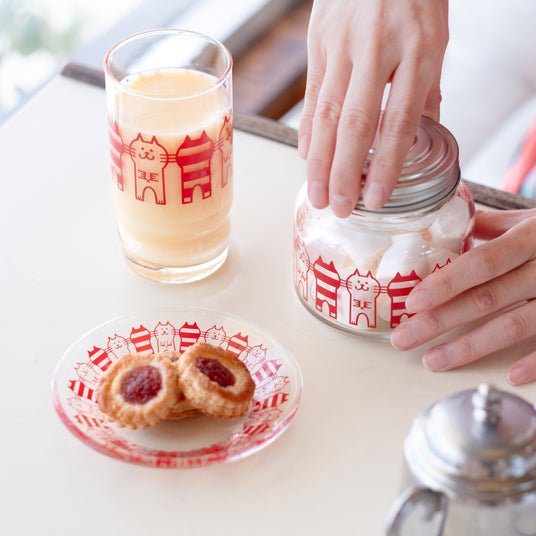 二本足で立ち上がった猫がかわいい「キャット」は、昭和45(1970)年に発売された柄です。「キャット」は、2025年9月に阪急うめだ本店で開催された催事『ときめきレトロ巡り』を記念し、公式SNSでの投票によって復刻が実現しました。アデリアレトロのグラスは、カラフルな色使いとポップなデザインが特徴ですが、今回の新柄はシリーズ初となる単色柄。ビビッドな赤色の猫たちが、ガラスを囲むように描かれています。よく見ると手の角度や表情が1匹ずつ微妙に異なる猫たちが、私たちを楽しませてくれます。