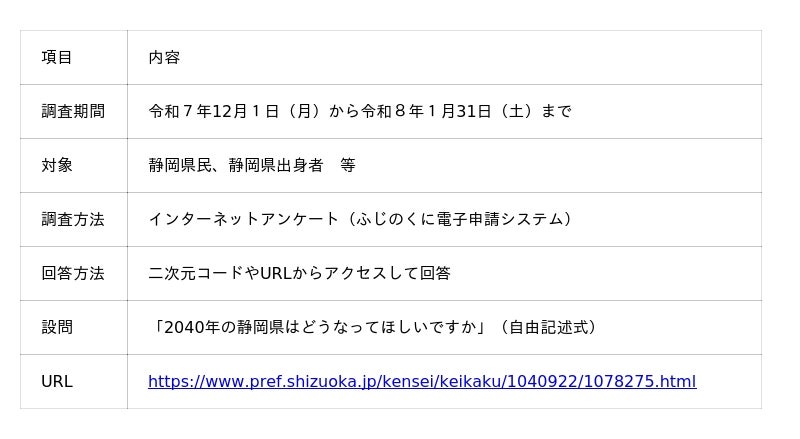 県政に県民の皆様の声を生かすため、2040年の静岡県はどうなってほしいか、御意見や思いを広く募集します。