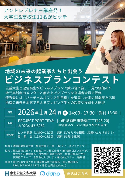 本イベントは、東北公益文科大学の授業「アントレプレナーシップ基礎a(ビジネスプラン講座)」 を受講する公益大生9名に加え、山形県立遊佐高校の代表生徒2名が発表します。