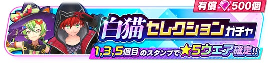 「モンストセレクションガチャ」からはマサムネ(CV:悠木碧)、ルシファー(CV:荻野葉月)の2キャラクターのみ、「白猫セレクションガチャ」からヴィヴィ(CV:石上静香)、赤髪のヒーロー(CV:梶裕貴)の2キャラクターのみの★5ウェアが登場予定です。本ガチャは有償ジュエル500個限定で5回までまわすことができ、1回目、3回目、5回目のスタンプでは★5ウェアが確定となります。それぞれのキャラクターは限定ウェアも登場します。