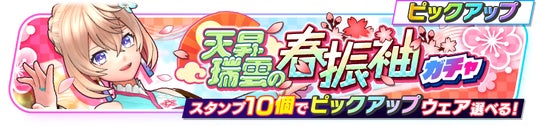 エレノア(CV:石見舞菜香)の着物風新ウェア、【★5天昇瑞雲の春振袖】がピックアップで登場します。また、10連ガチャを2回まで有償ジュエル350個でまわすことができます。