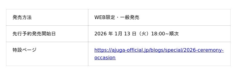 2026年1月13日(火)18:00より公式WEBストア(https://ajuga-official.jp/)にて先行予約販売をスタート、卒園式や入学式に向けて、手軽に高品質なキッズワンピースも登場します。
