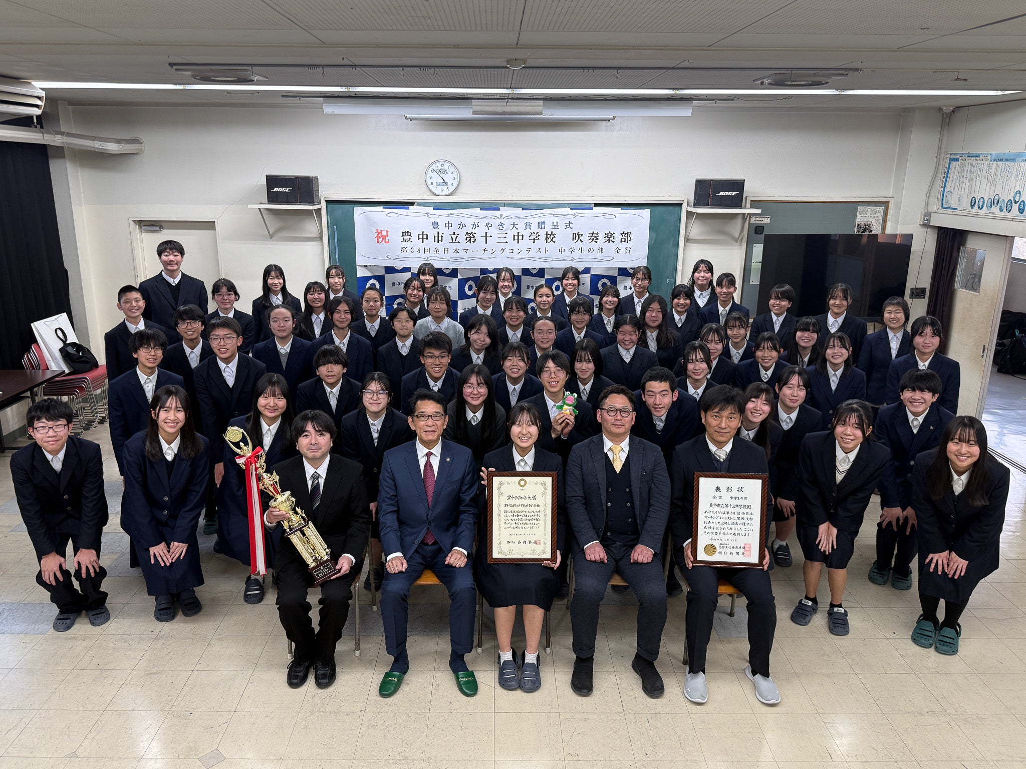 令和7年11月22日に大阪城ホールで開催された「第38回全日本マーチングコンテスト 中学生の部」において、豊中市立第十三中学校吹奏楽部が関西代表として出場し、金賞を受賞しました。